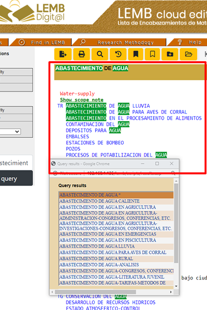 Double clicking on an authority from the list that is displayed in the window Query results, its contents will be displayed immediately (ABASTECIMIENTO DE AGUA, in this example), showing highlighted the words used in the search.